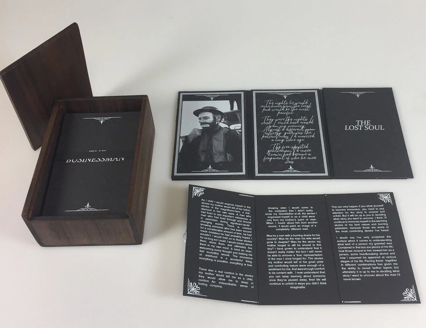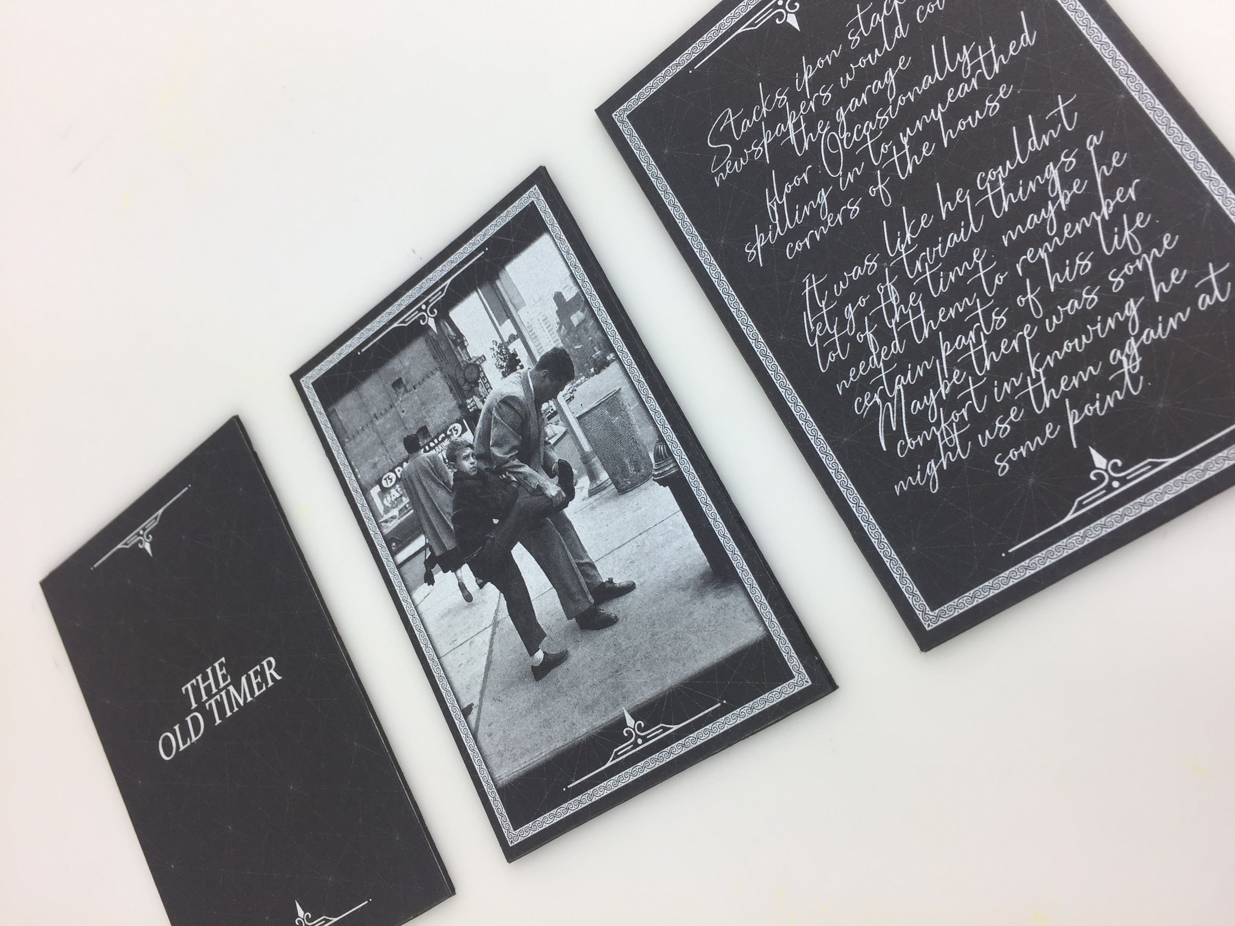 WITHIN THE BOX COMES 3 PIECES OF THE MAN I’D NEVER KNOWN. THROUGH A WAY OF ASSORTMENT, PIECING DIFFERENT TITLES/STORIES/IMAGES TOGETHER IN DIFFERENT VARIATIONS, HAS ALLOWED ME TO GAIN A DEEPER AND MORE MEANINGFUL UNDERSTANDING OF SOMEONE I’D NEVER MET.